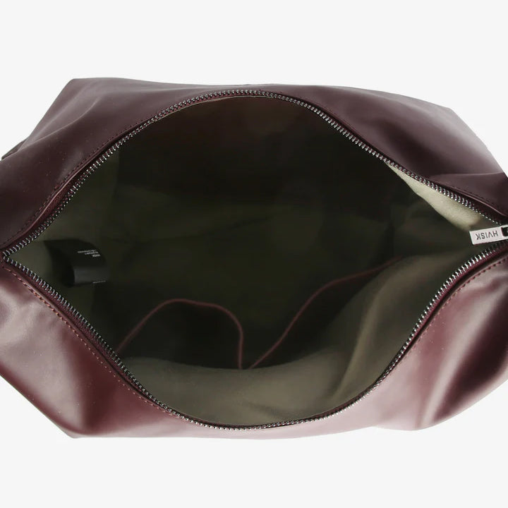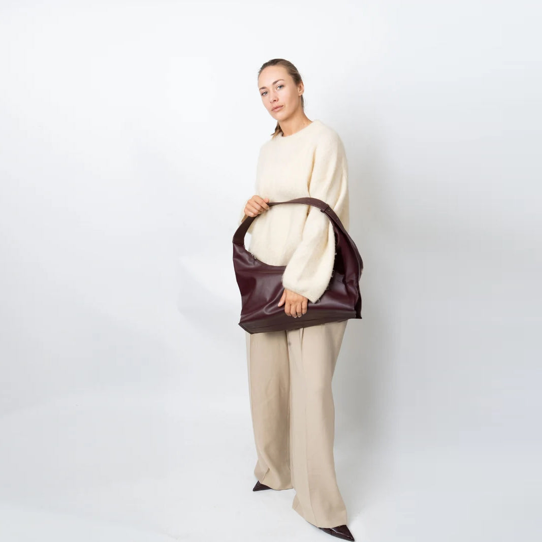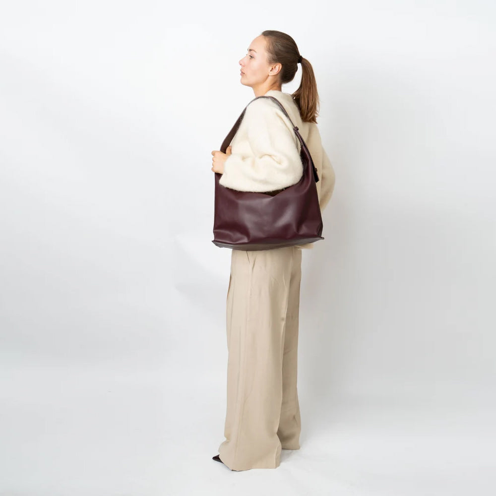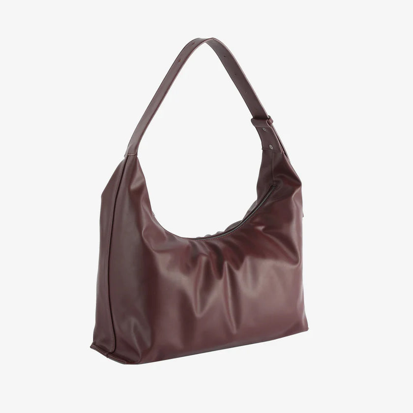 Shoulder bag with adjustable strap and zip closure. The bag contains one compartment with two inner pockets and one inner zip pocket.