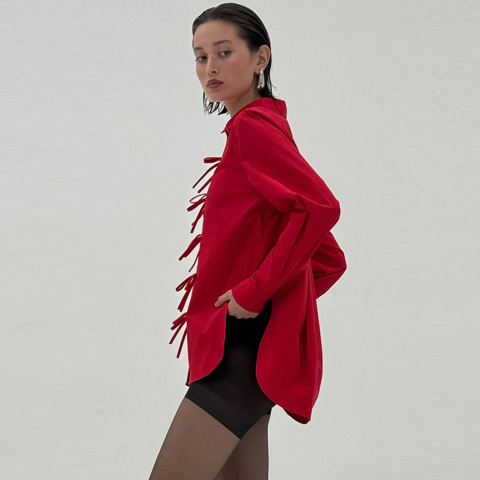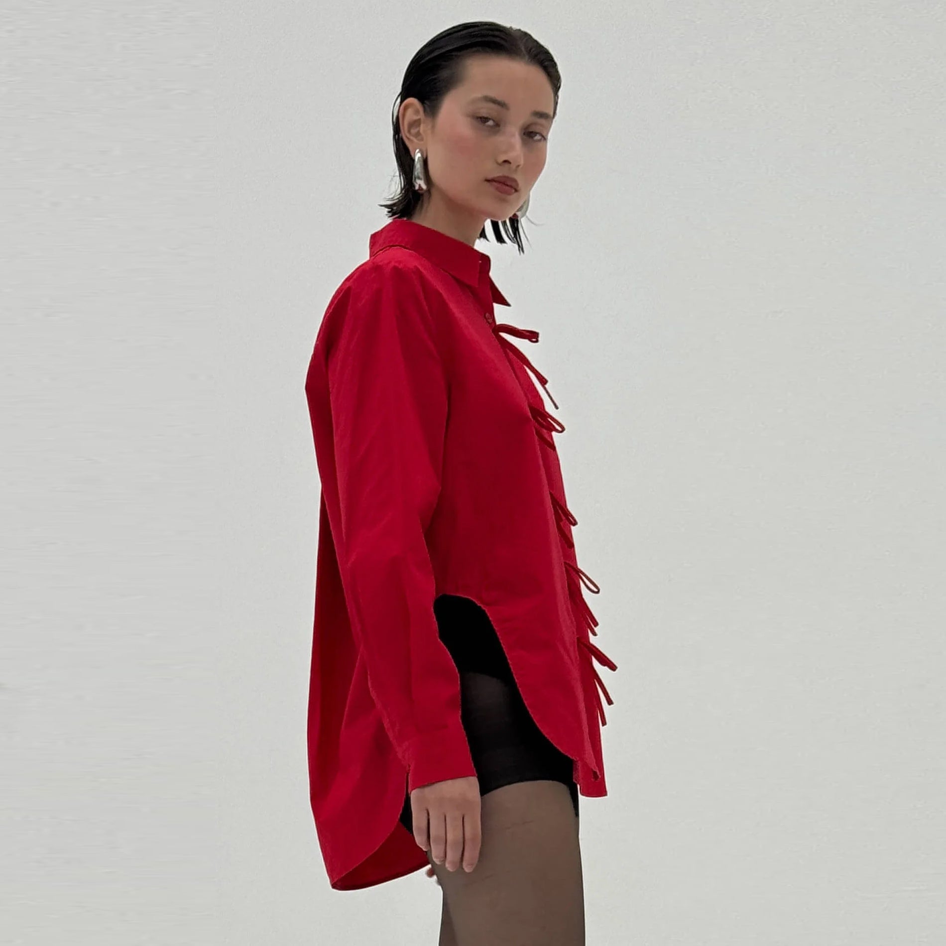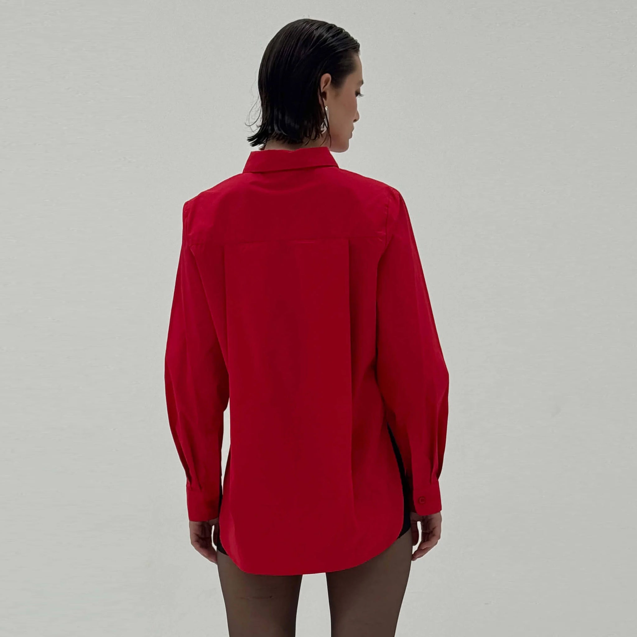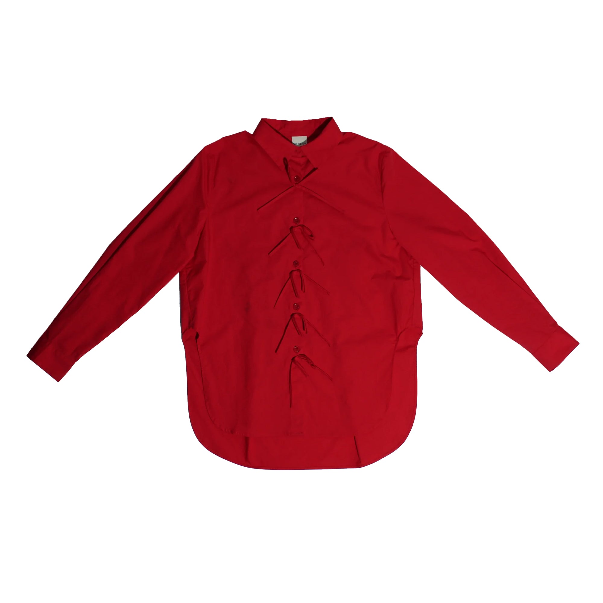 The Genevieve Shirt in Scarlet Red is made from light to medium-weight cotton shirting with a smooth, buttery feel. Structured and fitted with clean tailoring and lasting durability. A crisp essential in a bold, saturated hue, featuring bow buttons.