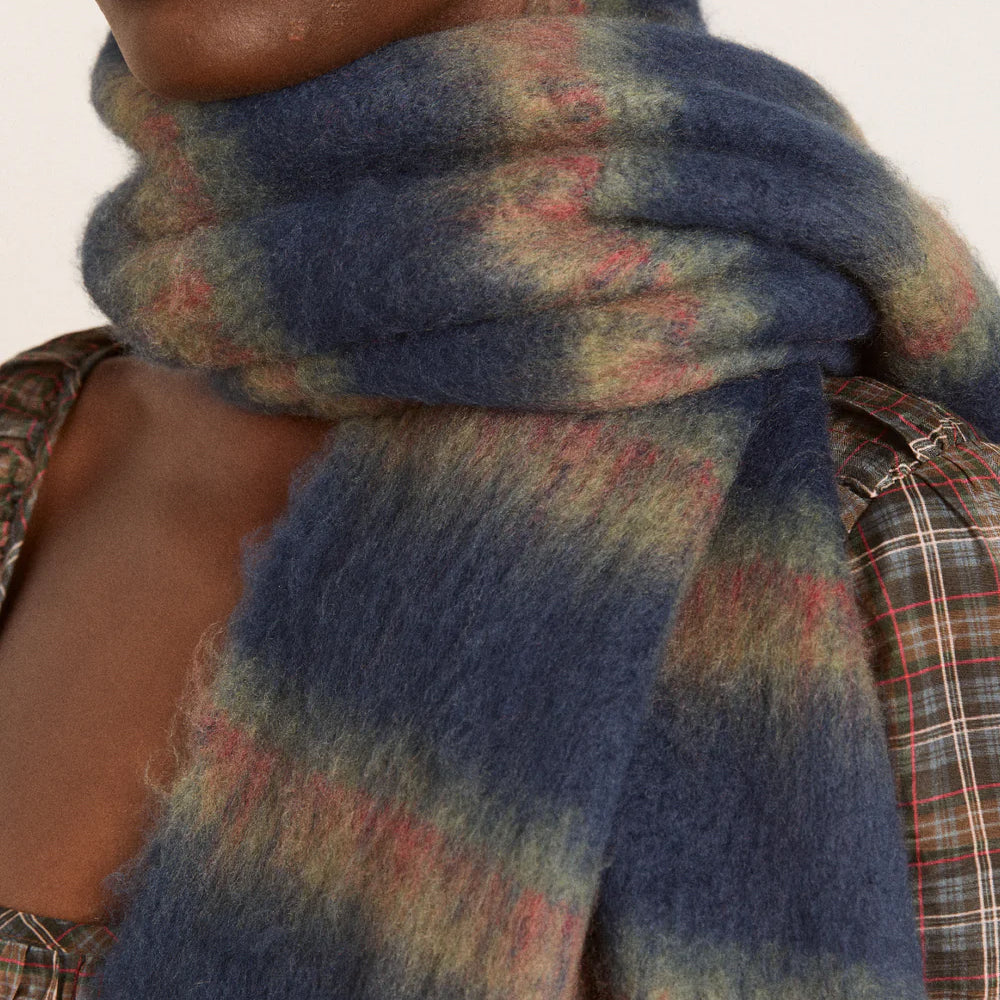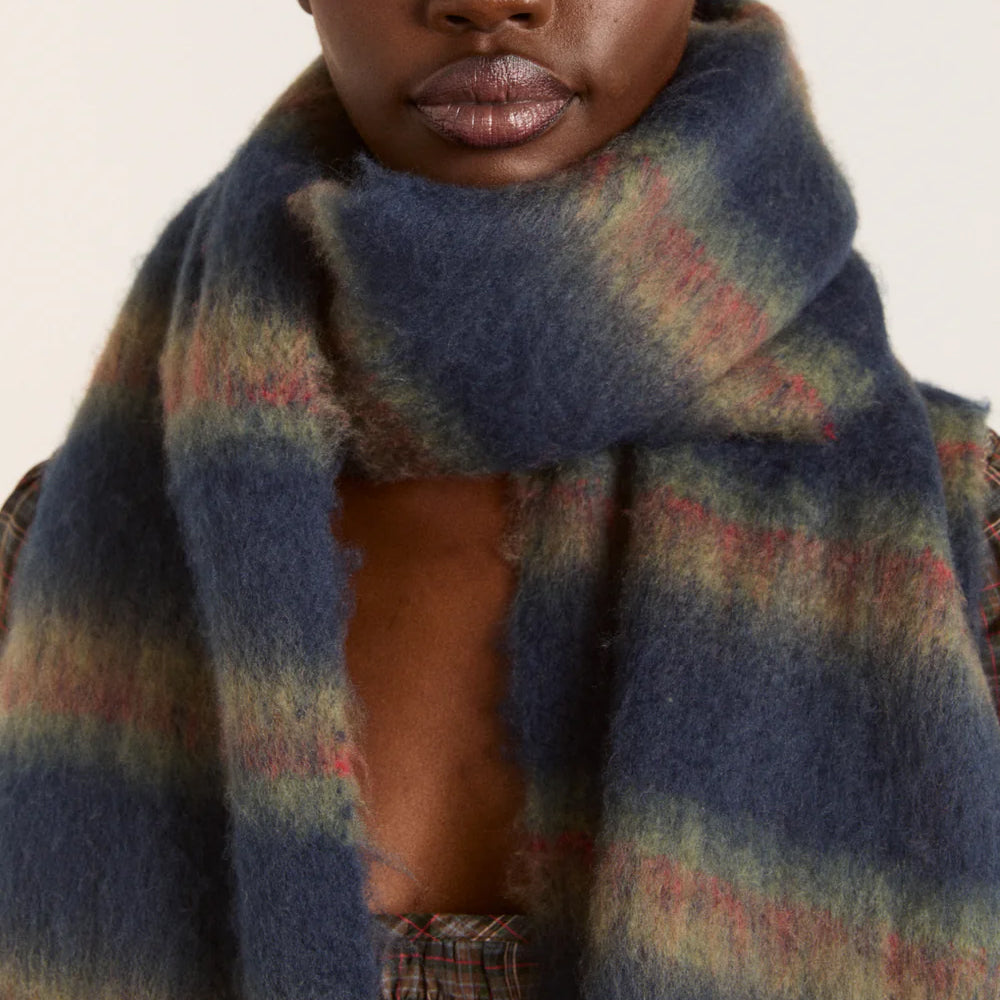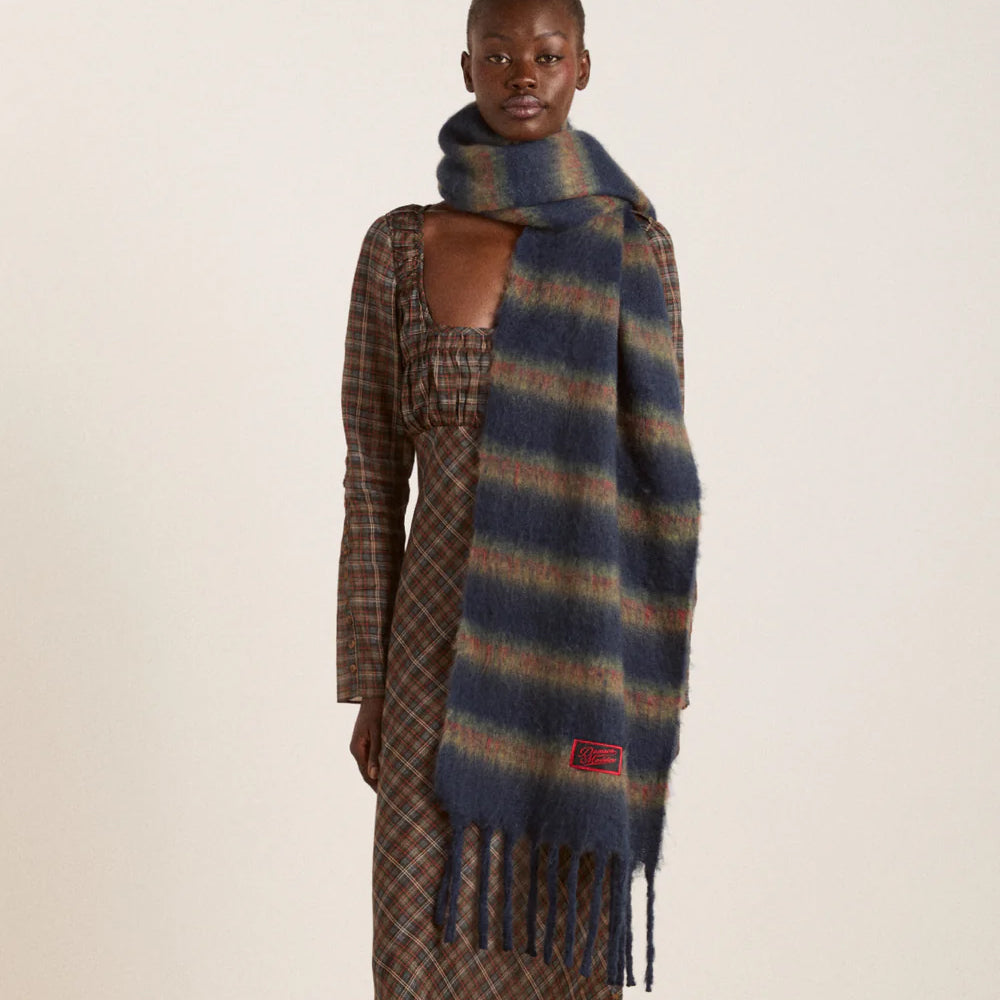 Our bestselling brushed oversized scarf is back in a new colour. Crafted in a luxuriously soft fabric, the Brushed Oversized Scarf in navy stripe is a winter staple. A Damson Madder woven logo patch and twisted fringe ends bring a refined finishing touch.
