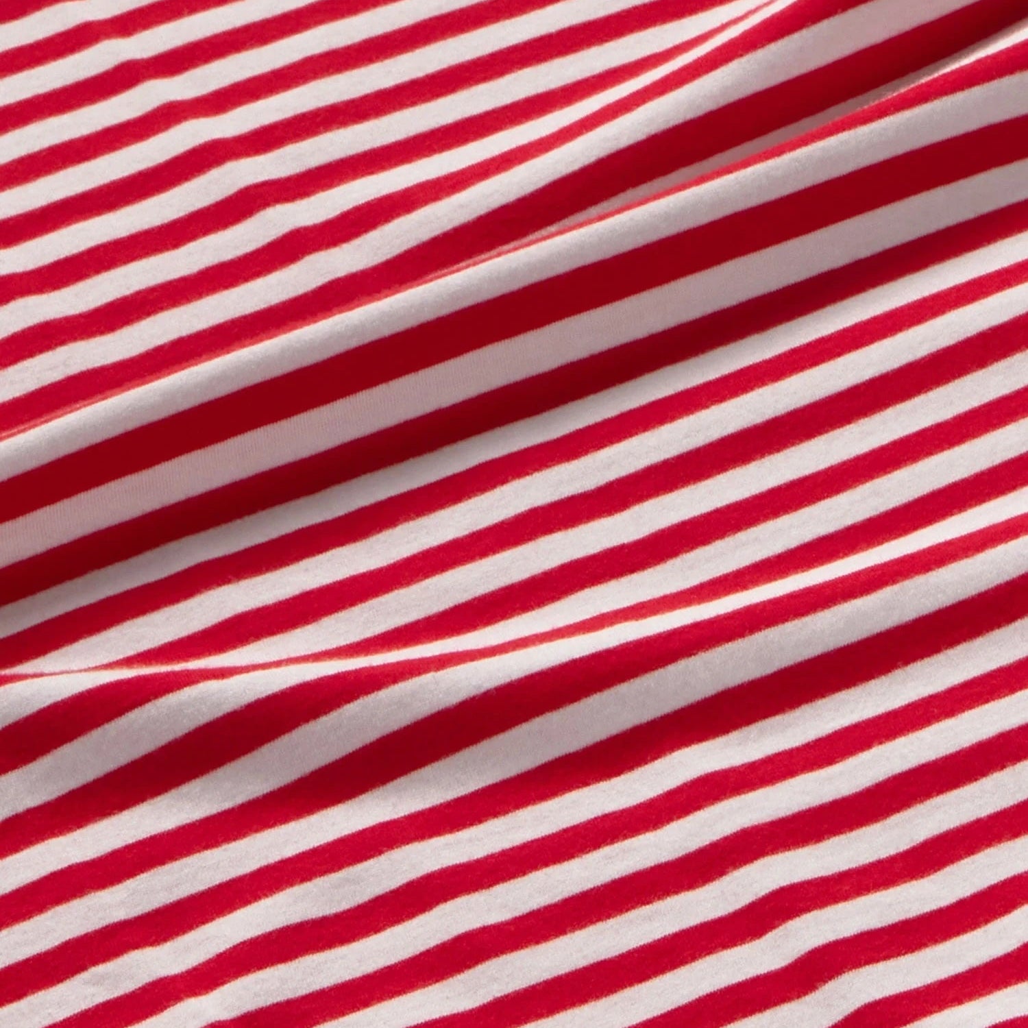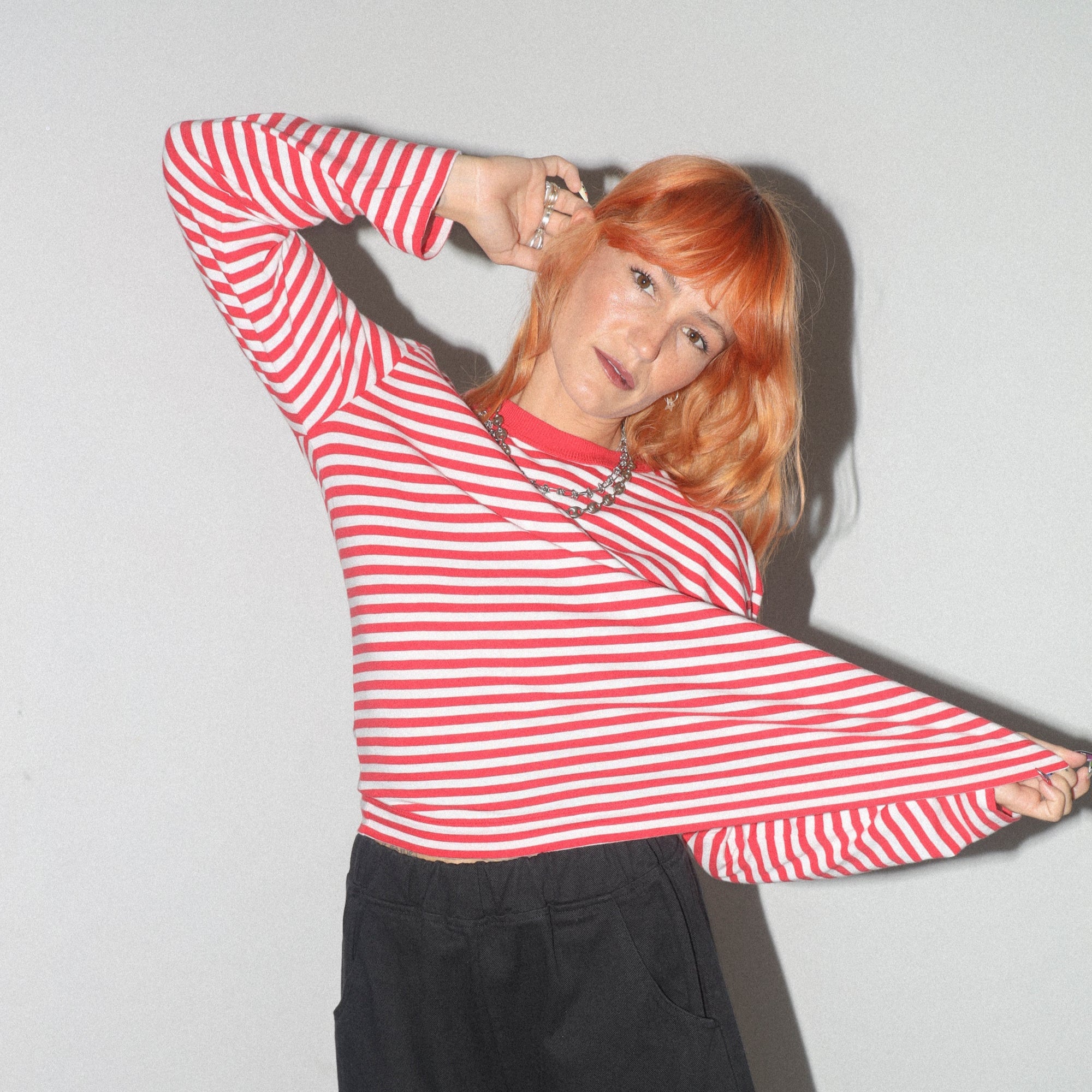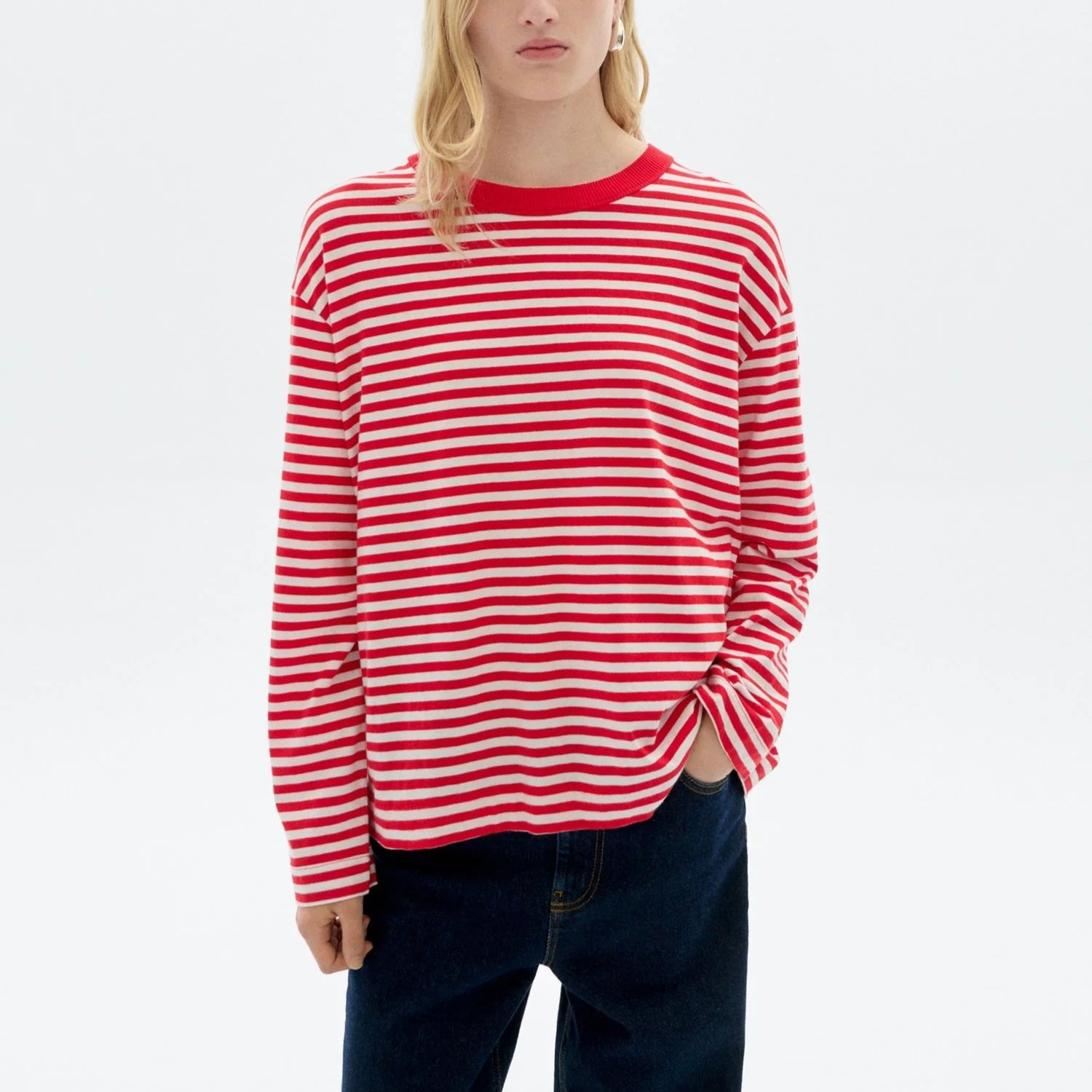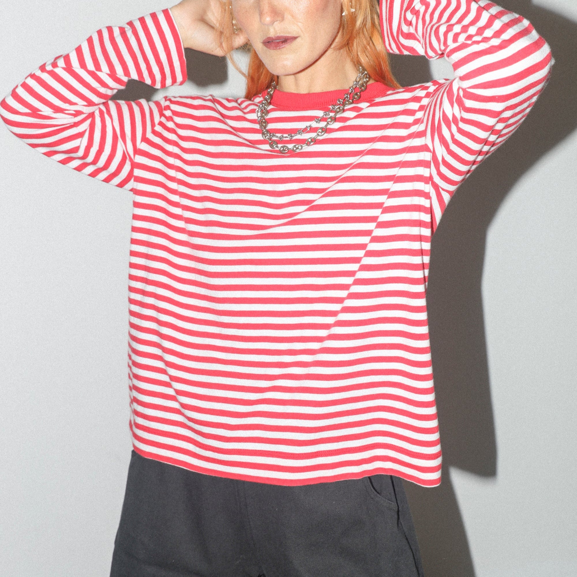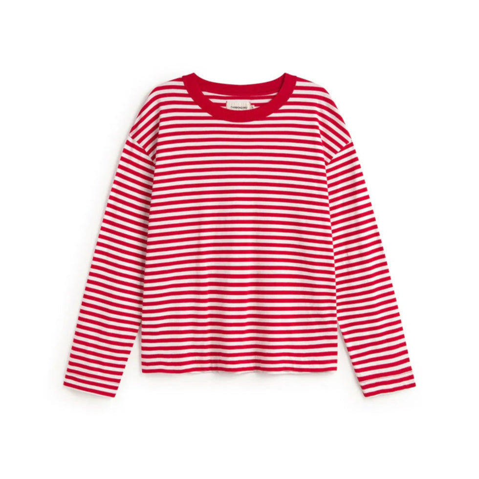 Red and white striped long sleeve tee with red contrast neck