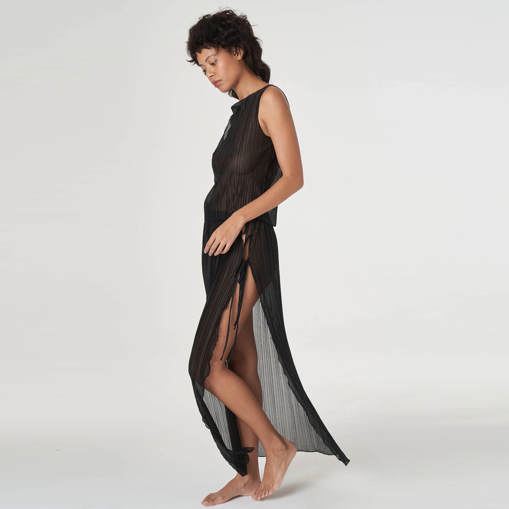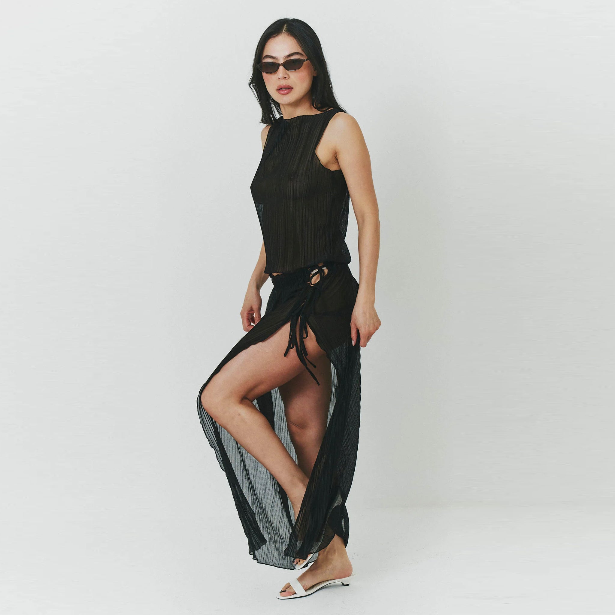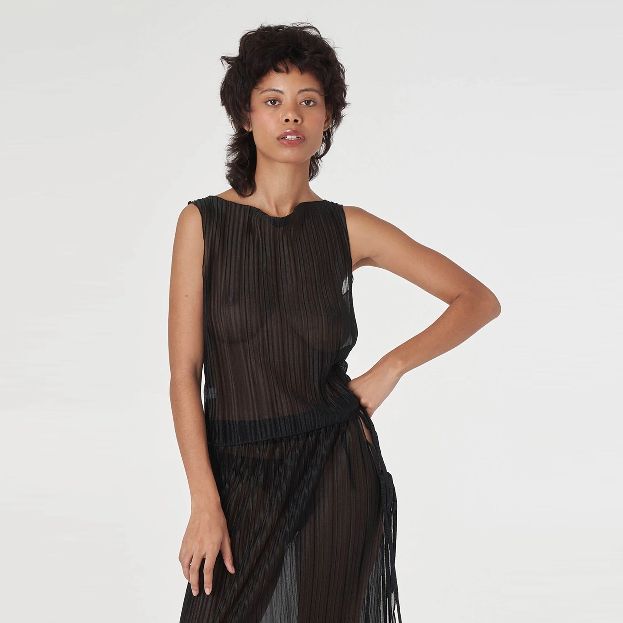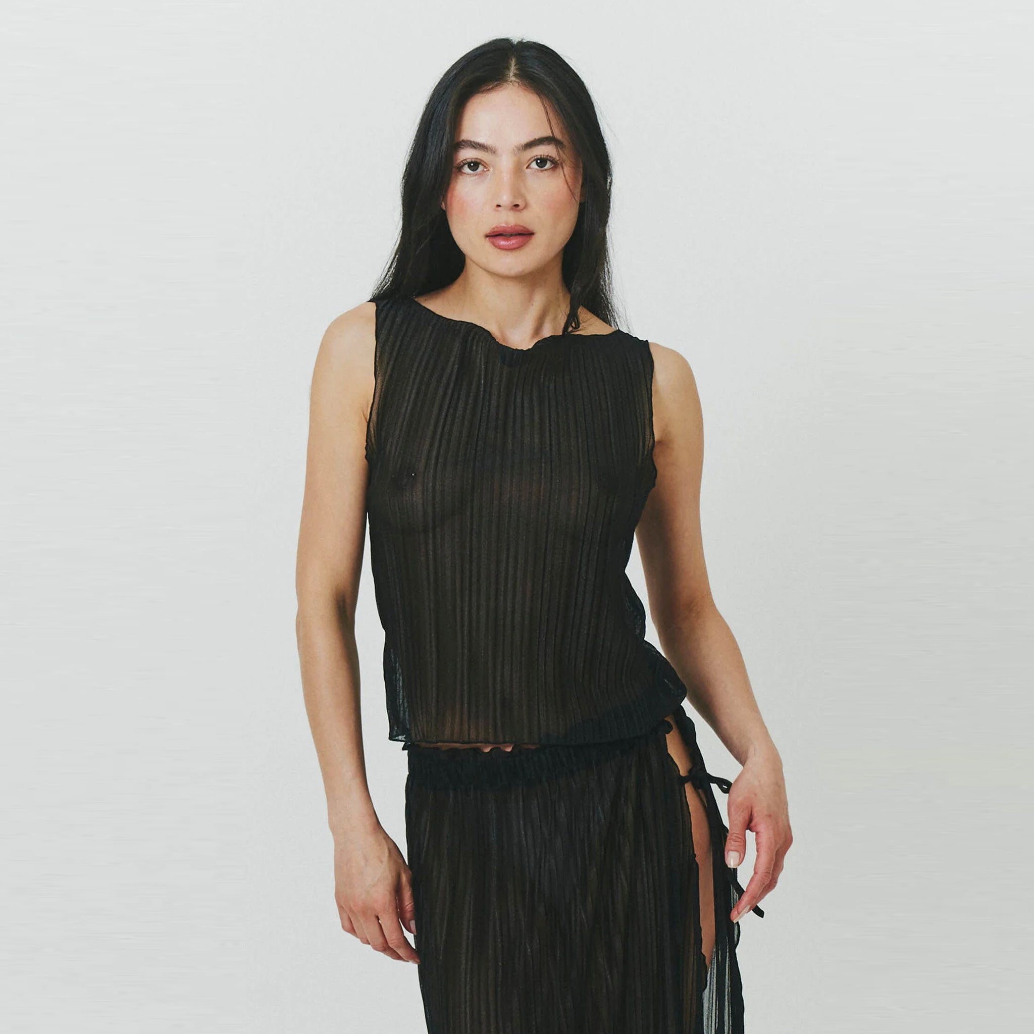 This elegant piece features delicate pleating enhanced with light lurex threading that catches the light with every movement. The refined boat neckline frames the collarbone beautifully, while the classic black hue ensures versatile wearability. Perfect for elevating evening looks or adding a touch of luxury to daytime ensembles.