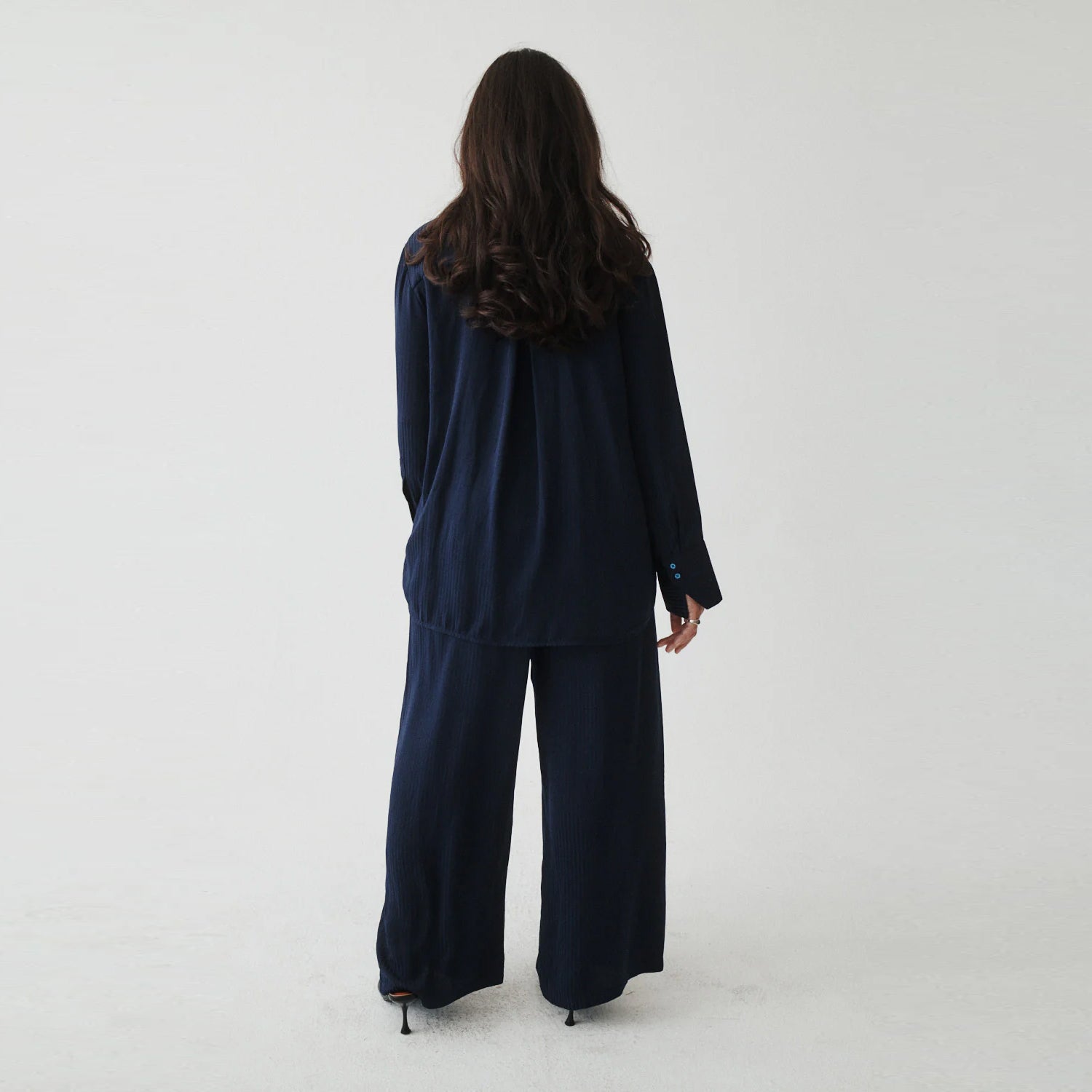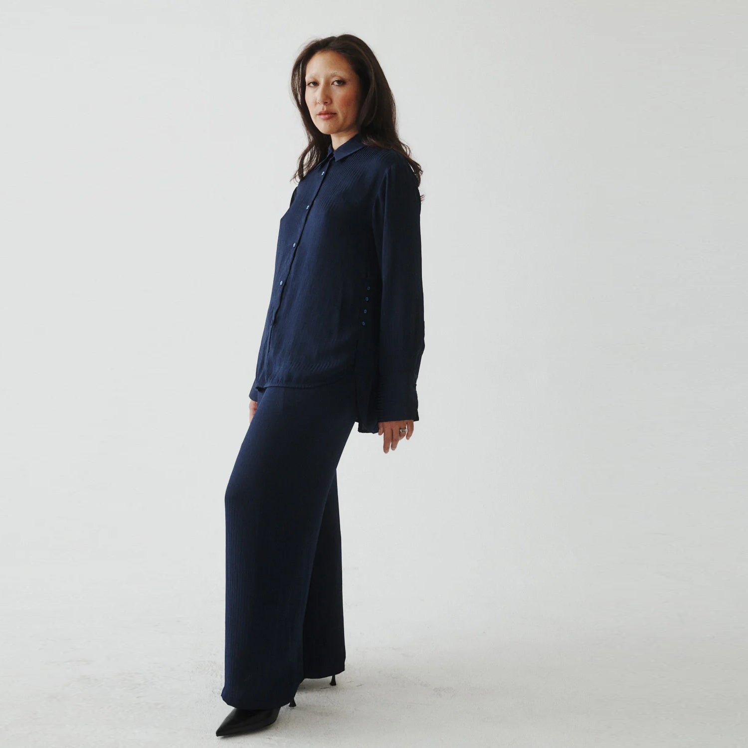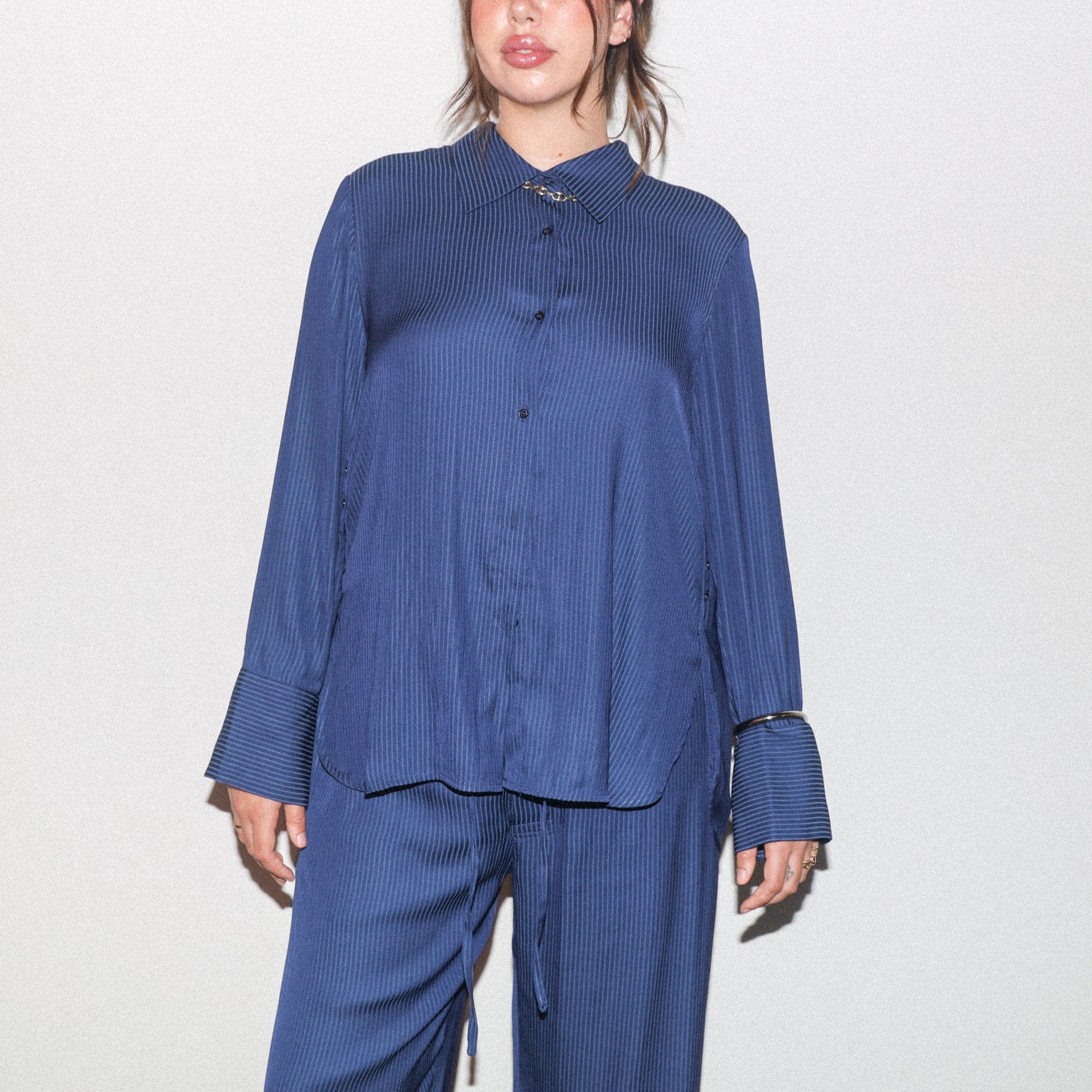 The Striped Satin Side Vent Shirt features convertible side-button vents, a pointed collar, back pleat, and buttoned cuffs, allowing multiple styling options from oversized to fitted.