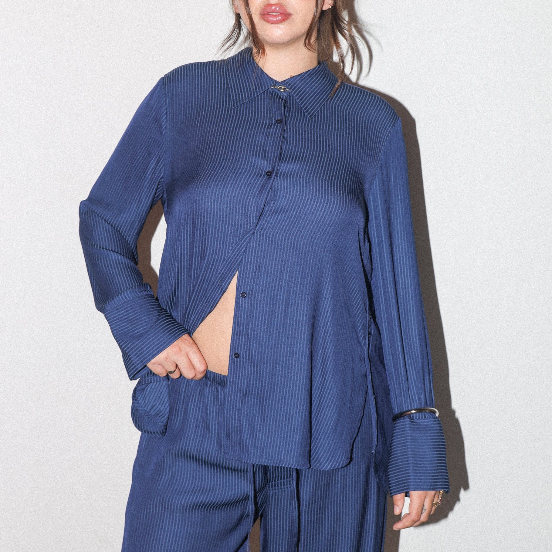 Ways to transform the STRIPED SATIN SIDE VENT SHIRT (1) undo side buttons for oversized fit, (2) undo side buttons and tie at the waist for ultra snatched waist, (3) misalign and rebutton the shirt for an avant garde look (4) just wear it like a normal shirt. It's a choose your own adventure. This style fits true to size.